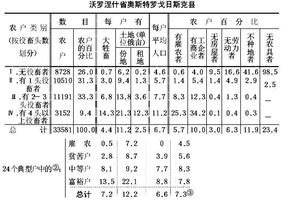 例如,舍尔比纳先生在第197页上已不是按份地面积,而是按役畜头数把农民分成几类,也就是按经济标志而不是按法律标志分类。这种分类使人有充分理由说,这24个典型户各类之间的比例,和全县各经济类别之间的比例是完全一致的。