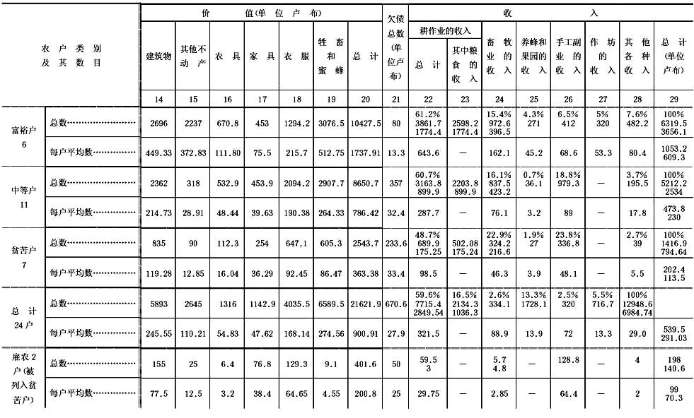 至于贫苦农民,他们经营农业简直是亏本;“副业”的作用在他们的家庭收支中更大(占收入的24%),并且这些副业几乎完全(只有一户除外)是出卖劳动力。其中有两户以“副业”(当雇农)为主,占收入的2/3。