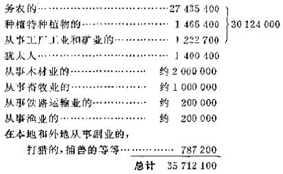 “近来有人试图确定欧俄50个省份的全部自由工人数目(谢·亚·柯罗连科的《自由雇佣劳动》1892年圣彼得堡版)。据农业司调查,欧俄50个省份有劳动能力的农村人口共计35712000人,而农业、加工工业、采掘工业、运输业等等所需的工人总数不过是30124000人。可见完全多余的过剩工人是一个达5588000人的巨大数目,连同家属〈按通常的标准算)合计,当不少于1500万人。”(该书第341页又重复了一遍)