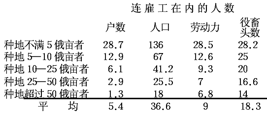 如果折算一下劳动力和播种面积的比例,我们就可得出各类农民每100俄亩播种面积分别有: