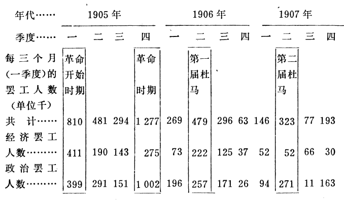 总的说来,整个18年间,我国每年平均罢工人数是345400人。德国在14年间(1899—1912年)平均罢工人数是229500人,英国在20年间(1893—1912年)平均罢工人数是344200人。为了具体地说明俄国罢工同政治历史的联系,我们列出1905—1907年的材料,一年分四个季度: