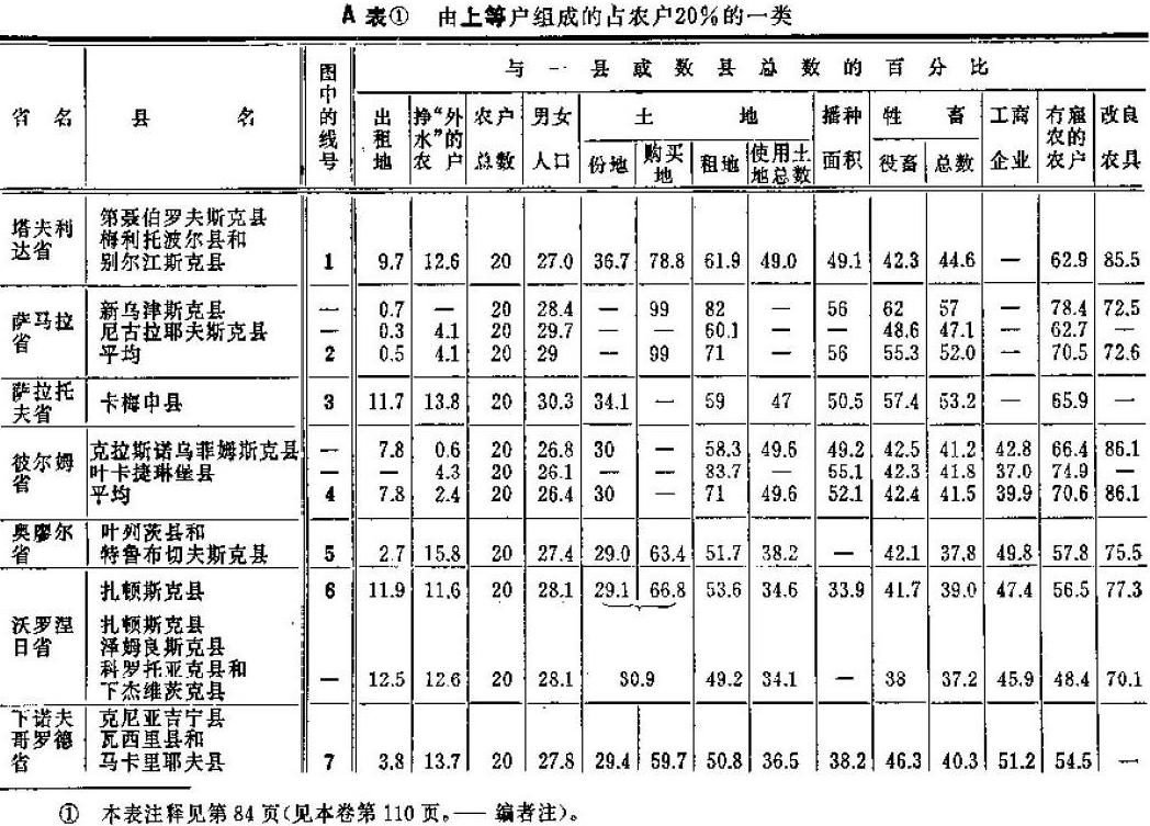 (66) 如果把这些家庭收支表中关于各类农户的建筑物,农具和牲畜的价值标准额运用到上述欧俄49省的总结资料中,那就可以看出,1/5的农户所占有的生产资料的数量比其他所有农户占有的要大得多。
