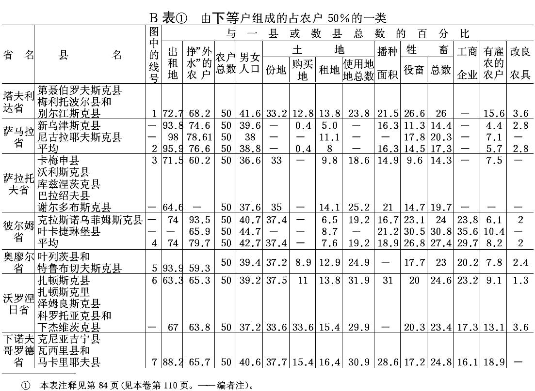 (89) 唯一的例外是伊·古尔维奇的优秀著作《俄国农村的经济状况》1892年纽约版,俄译本1896年莫斯科版。古尔维奇先生整理地方自治局统计汇编的技巧真是令人惊奇,因为汇编没有提供按殷实程度划分各类农户的综合表。