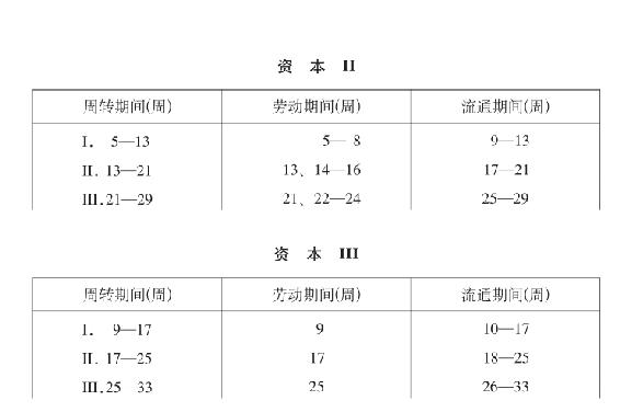 为了便于计算,我们假定:劳动期间为5周,流通期间为5周,因而周转期间为10周;一年按50周计算,每周的资本支出是100镑。这样,劳动期间需要有流动资本500镑,流通时间也需要追加资本500镑。劳动期间和周转时间如下: