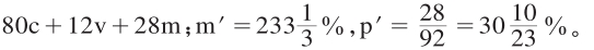III. 60c+20v+20m;C= 80,m′=100%,p′=25% ;那么就会得到如下的比例: