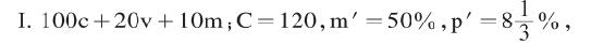 I. 100c+20v+10m;C=120,m′=50%,p′=
