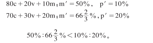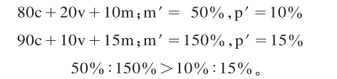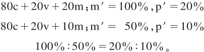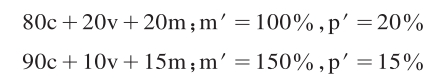 在这两个场合,剩余价值率m′都是=100%,利润率都是=20%。