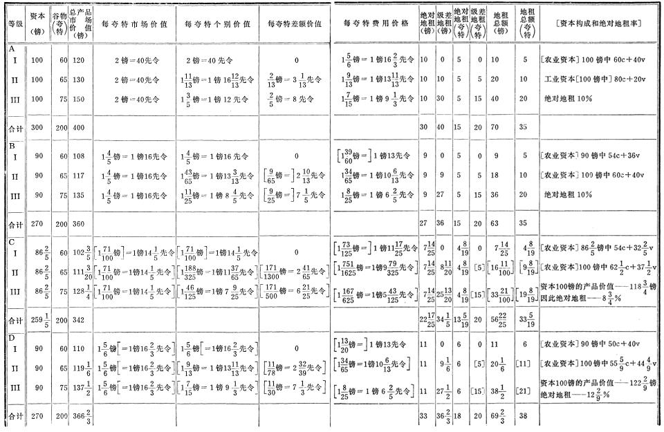 最初,在A的情况下,[农业资本的各有机组成部分之间的]比例是60c+40v;投入每级土地的资本都是100镑,地租表现为货币是70镑,表现为谷物是35夸特。