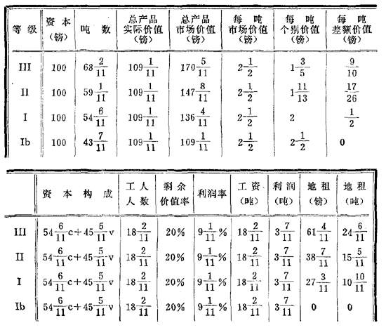 至于Ⅱ,这里产品的[实际]价值也等于120镑等等。但是因为每吨个别价值等于1+(11/13)镑(或24/13镑),所以这个等级生产65吨(因为120除以24/13等于65)。简单地说,我们在这里得到的是第574页上的A表。但是因为在这里我们需要有几个新项目来适应我们的目的,所以当出现Ⅰ这个等级而产品市场价值提高到2镑时,我们就要为这第三种场合制一个新表。
